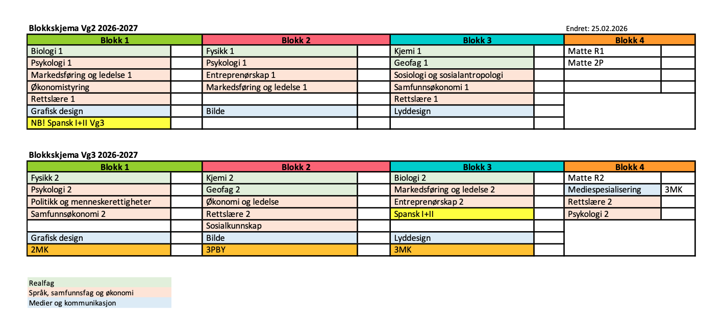 Nedenfor finner du blokkskjema for VG2 og VG3. Dette blokkskjemaet viser hvilke programfag elevene studieforberedende utdanningsprogram kan velge for neste skoleår.